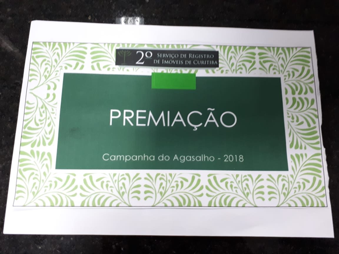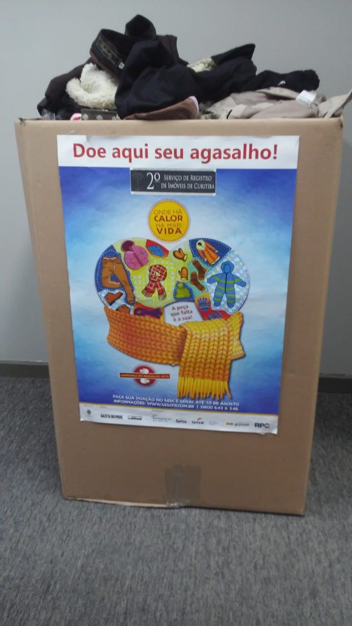 Nos meses de junho e julho de 2018, o 2º Serviço de Registro de Imóveis de Curitiba realizou a “Gincana do Agasalho”, com o intuito de colaborar com a Campanha do Agasalho desenvolvida pelo Sistema Fecomércio, que administra o Serviço Social do Comércio (Sesc) e Serviço Nacional de Aprendizagem Comercial (Senac), pelo o Instituto GRPCOM e pela RPC, em parceria com o Exército Brasileiro.